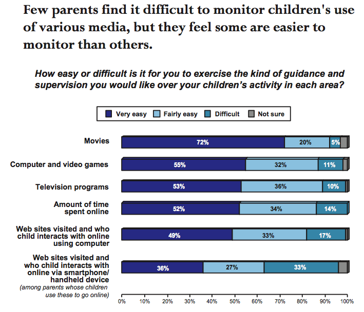 - Hanya sedikit orang tua yang merasa kesulitan mempraktekkan panduan dan pengawasan terhadap anak-anak mereka yang aktif berinternet. Kegiatan menonton film di televisi lebih mudah diawasi daripada kegiatan online, apalagi jika mereka menggunakan telepon genggam, atau telepon pintar.