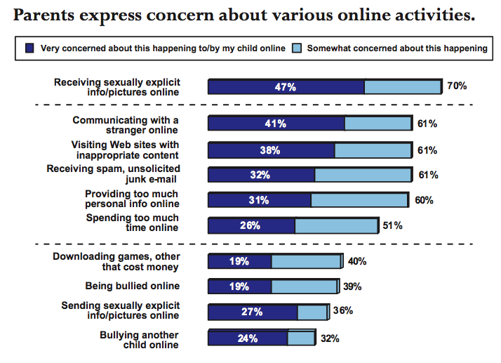 - Pada umumnya para orang tua merasa perilaku anak-anak mereka cukup aman di interent, tetapi orang tua dari anak-anak yang masih kecil justru merasa lebih percaya diri bahwa anak-anak mereka lebih aman. Kecemasan paling besar terhadap kemananan anak-anak mereka di internet adalah persoalan kemanan pribadi.