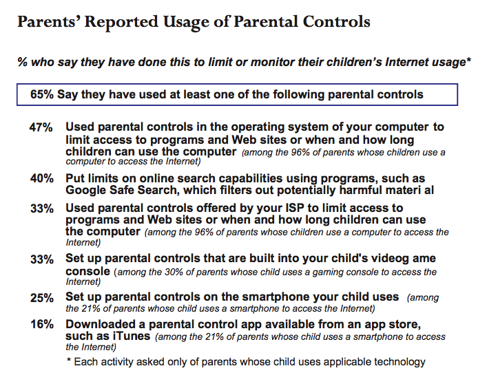 - Cara para orang tua mengawasi anak-anak mereka di internet cukukp beragam. Tercatat ada 18 cara yang dilakukan, tetapi yang paling umum adalah membuat peraturan atau membatasi apa yang boleh dillakukan ketika anak-anak online. Banyak pula yang senagaj menerapkan bloking terhadap situs-situs atau layanan lain di internet yang dianggap belum layak diakses untuk anak-anak mereka.